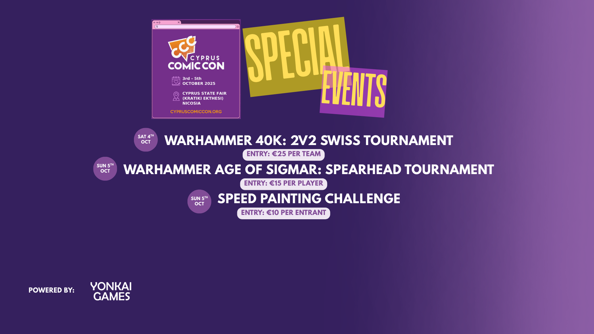 WARPGaming is going to Cyprus Comic Con! But that's not all... we've got a few special events in store as well. Not one, or two, but THREE tournaments. Warhammer players, and...